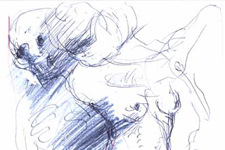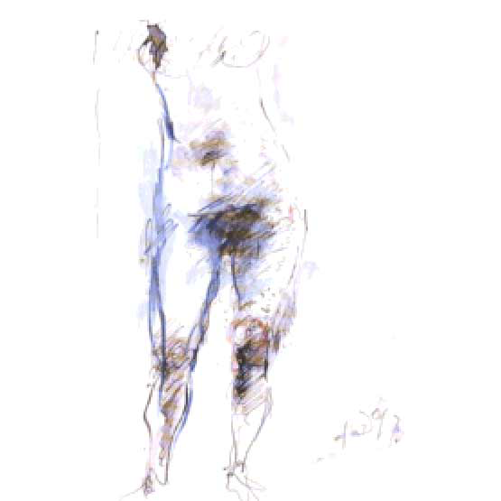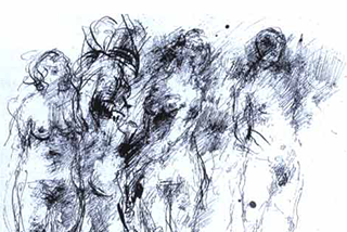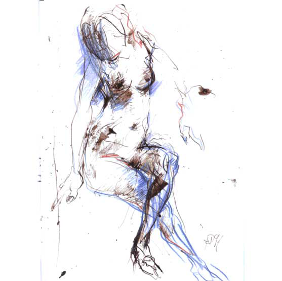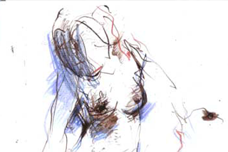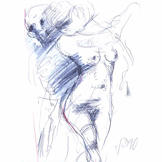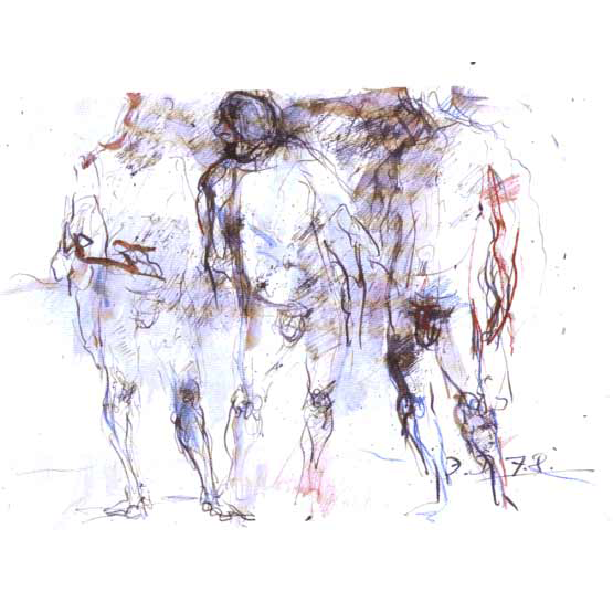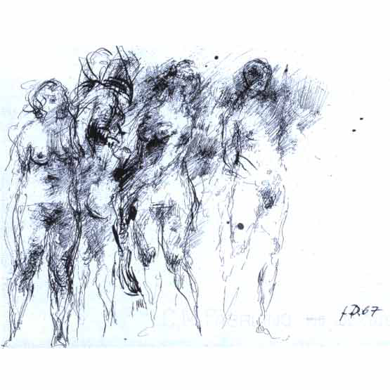 Keine Figur, keine Szene verfestigt sich bei Dunkel innerhalb definierter Umrisse. Alles Dargestellte bleibt vielmehr pulsierend in einem kaum zu beschreibenden Schwebezustand. Der Zeichner verzichtet auf eine Sicherheit, die auch den Betrachter in Sicherheit wiegen würde. Was als Angabe eines anatomischen Details erscheint, ist stets in Wahrheit ein impulsiver Strich oder eine Anzahl solcher Bewegungszüge. Primär das Transitorische wird dadurch betont. Und die vom Gegenstand sich lösende Form wird frei zum Ausdruck von Seelischem und Geistigem, das der dargestellten Figur zugehört, zugleich aber auch auf den Künstler zurückverweist. Diese Identifizierung bewirkt eine intensivere, tiefer greifende Ansprache des Betrachters als jede unverrückbar gemachte "objektive" Feststellung. Fern jeder Konzeptualisierung, fern von gesetzten Bildtiteln stimuliert der Künstler die je eigene Wahrnehmung.